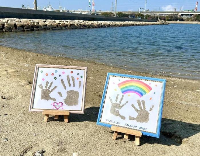 砂浜の砂を使って、自分の手形を記念に残しませんか?フレームに色を塗ったり、色紙にサインしたり、自由に作ることができます!