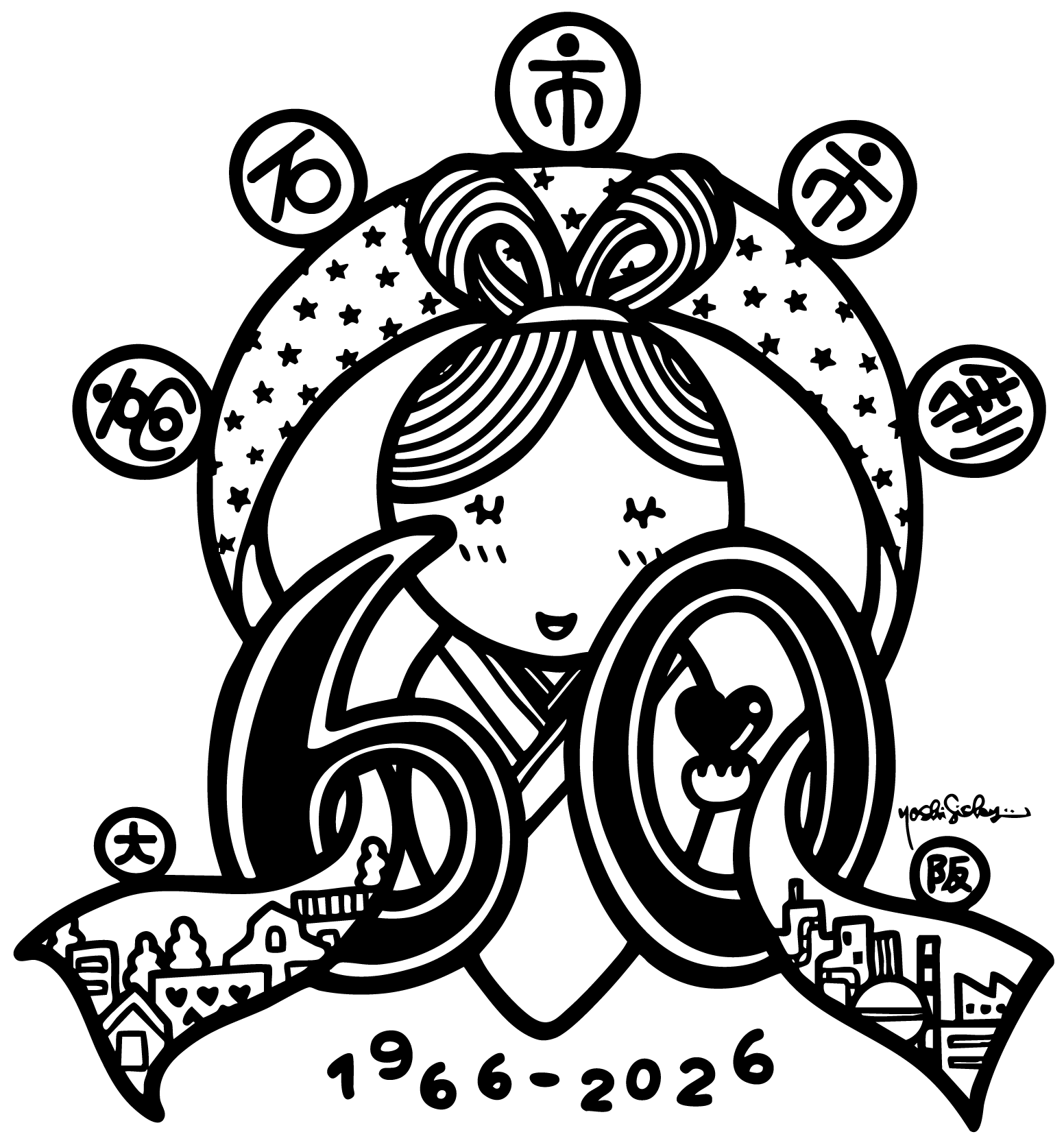 令和8年11月、高石市は市制施行60周年を迎えます。この節目を市民の皆さんとともに祝い、未来へのさらなる発展をめざすために天女をモチーフに「地元への感謝と誇り」が込められた60周年ロゴを、市出身の世界的アーティスト Yoshi Sislay(ヨシ・シスレー)氏 にデザインしていただきました!